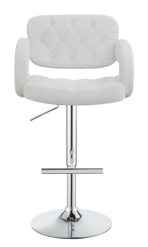 Coaster Z2 PremiumA rec room or home bar never had such chic bar seating. Chrome finish leg and base with shimmering white upholstery. Cushioned seat adjusts to maxi...