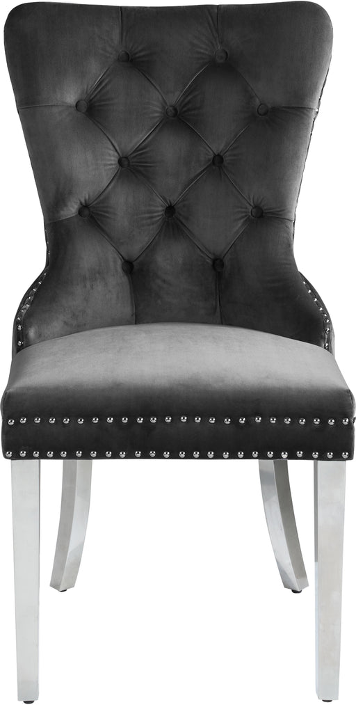MeridianCarmen Grey Velvet Dining Chairs (2) - Luxurious Grey Velvet - Gold Metal Legs - Deep Button Tufting - Gold Knocker on Back