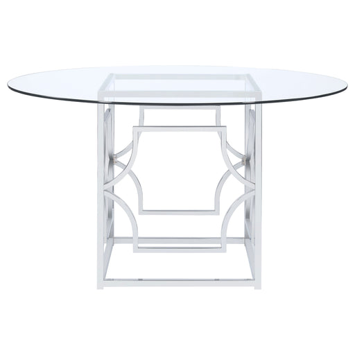 Coaster Z2 PremiumThis round dining table creates a refined focal point with its clear tempered glass top and artful geometric base. The sculptural metal frame featu...