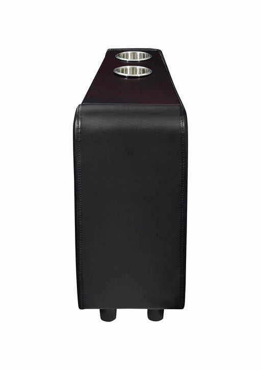 Coaster Z2 PremiumEnhance your home theater setup with this versatile wedge console, designed to fit seamlessly between two recliners. Upholstered in sleek black lea...